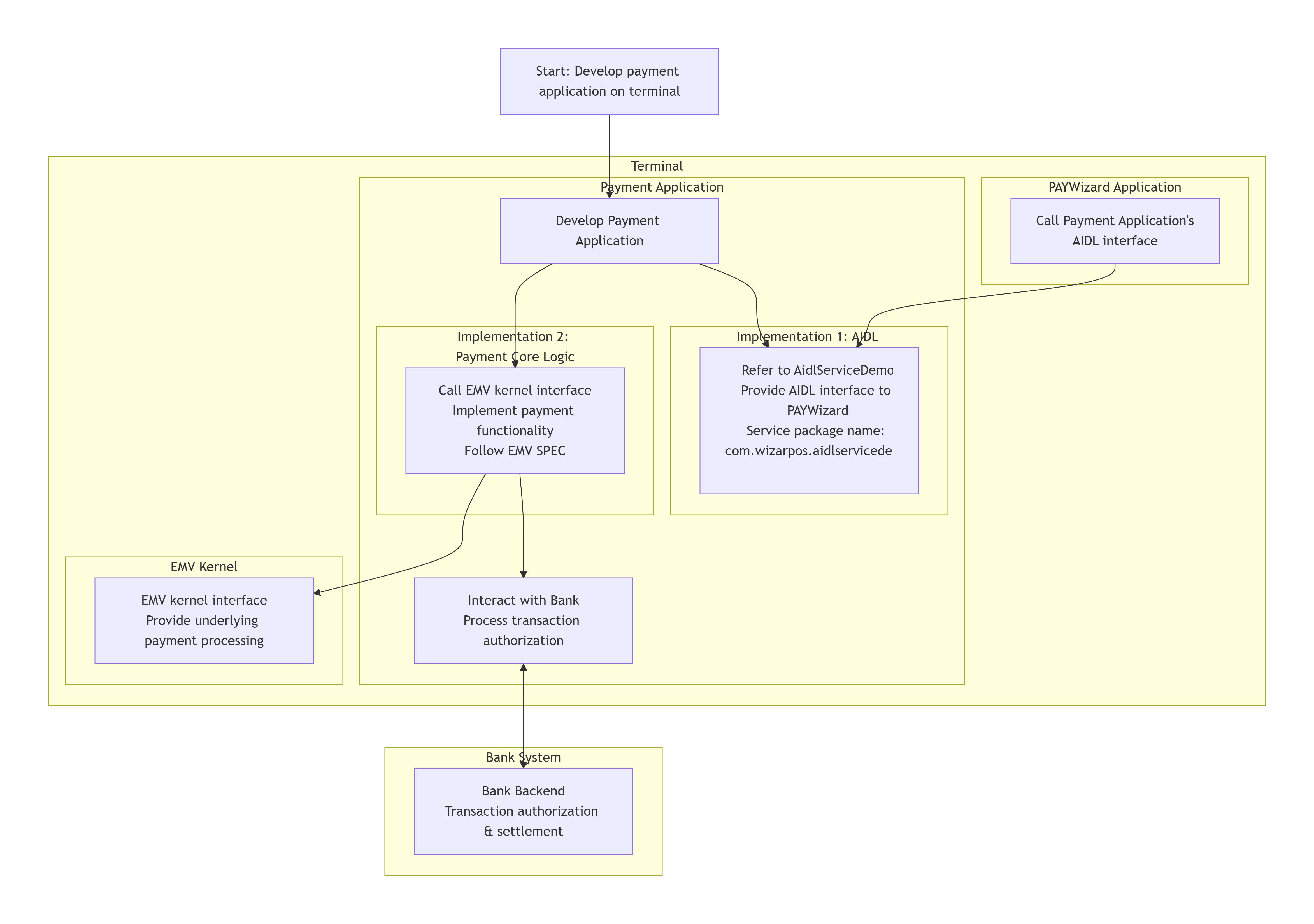 It is suitable for developing payment application on the terminal. This payment application interacts with the bank and provides the AIDL interface of the payment function to the PAYwizard to call.